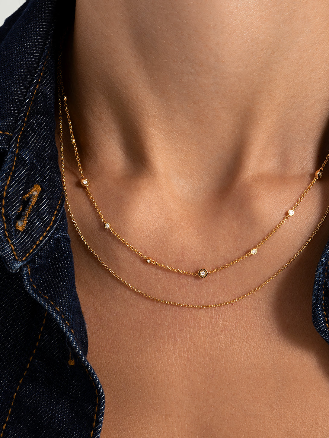 This station necklace, adorned with moissanites, resembles a constellation and features alternating engraved star motifs and a smooth chain. While it modernizes the design, it still captures the glamour of the 1970s. It can be worn alone as a choker for everyday use and pairs well with our crystal station bracelet.