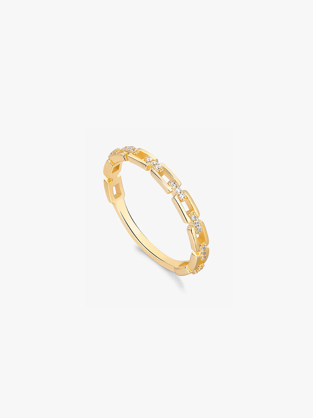 The Rectangle Link Delicate Ring is 18k gold plated rectangular chain link band ring with pavé diamonds set in each connecting link and a flat base shank for comfort. Handcrafted in 18k gold vermeil with cubic zirconia crystals.