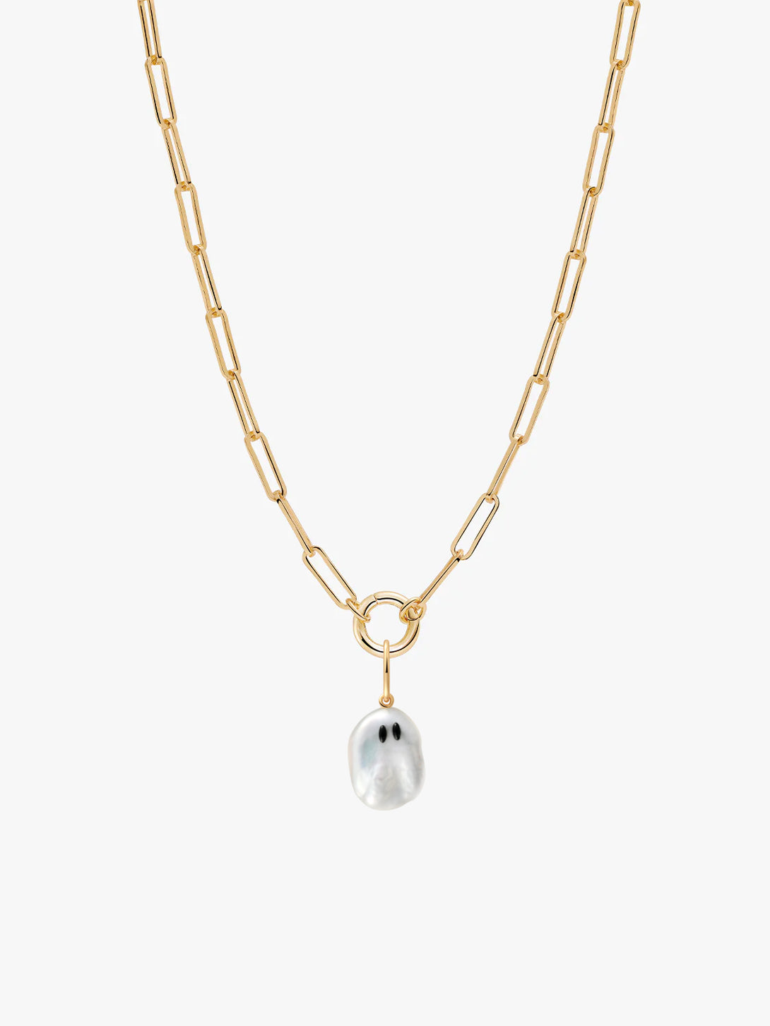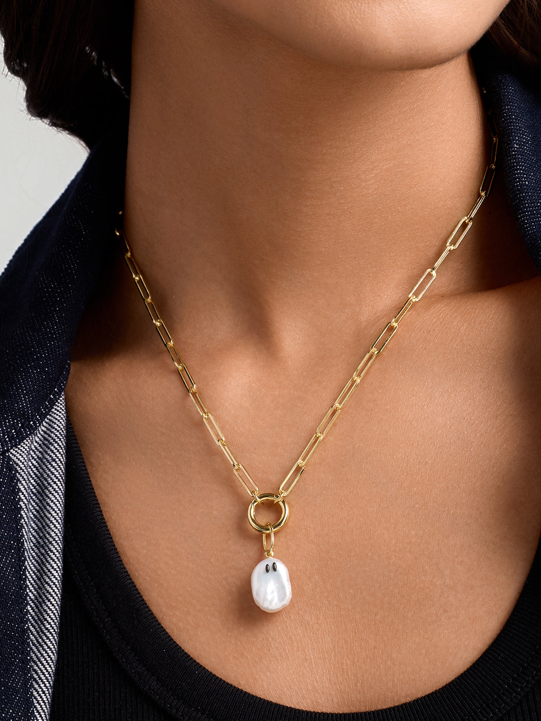 Our Ghostie Pearl Paperclip Necklace brings a playful twist to timeless elegance. Featuring a baroque pearl pendant with the sweetest ghostly face, it hangs from a gleaming 18K gold vermeil paperclip chain that catches the light just right.
