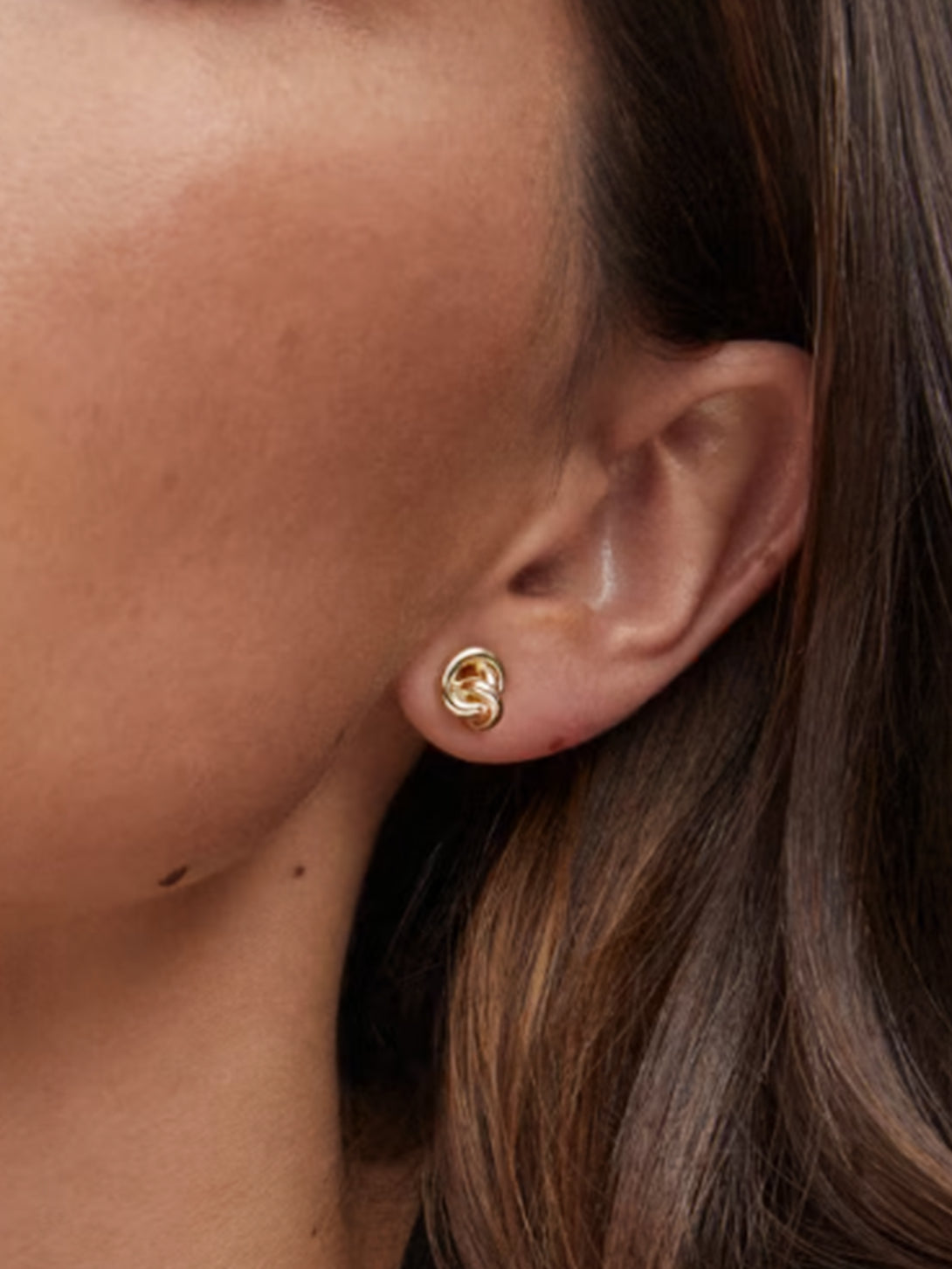 A modern take on a timeless knot motif. These studs feature smooth, interlocking curves that create a soft, sculptural shine—perfect for adding subtle elegance to your everyday look. Lightweight, versatile, and polished from every angle, they make effortless staples whether worn alone or paired with your favorite pieces.