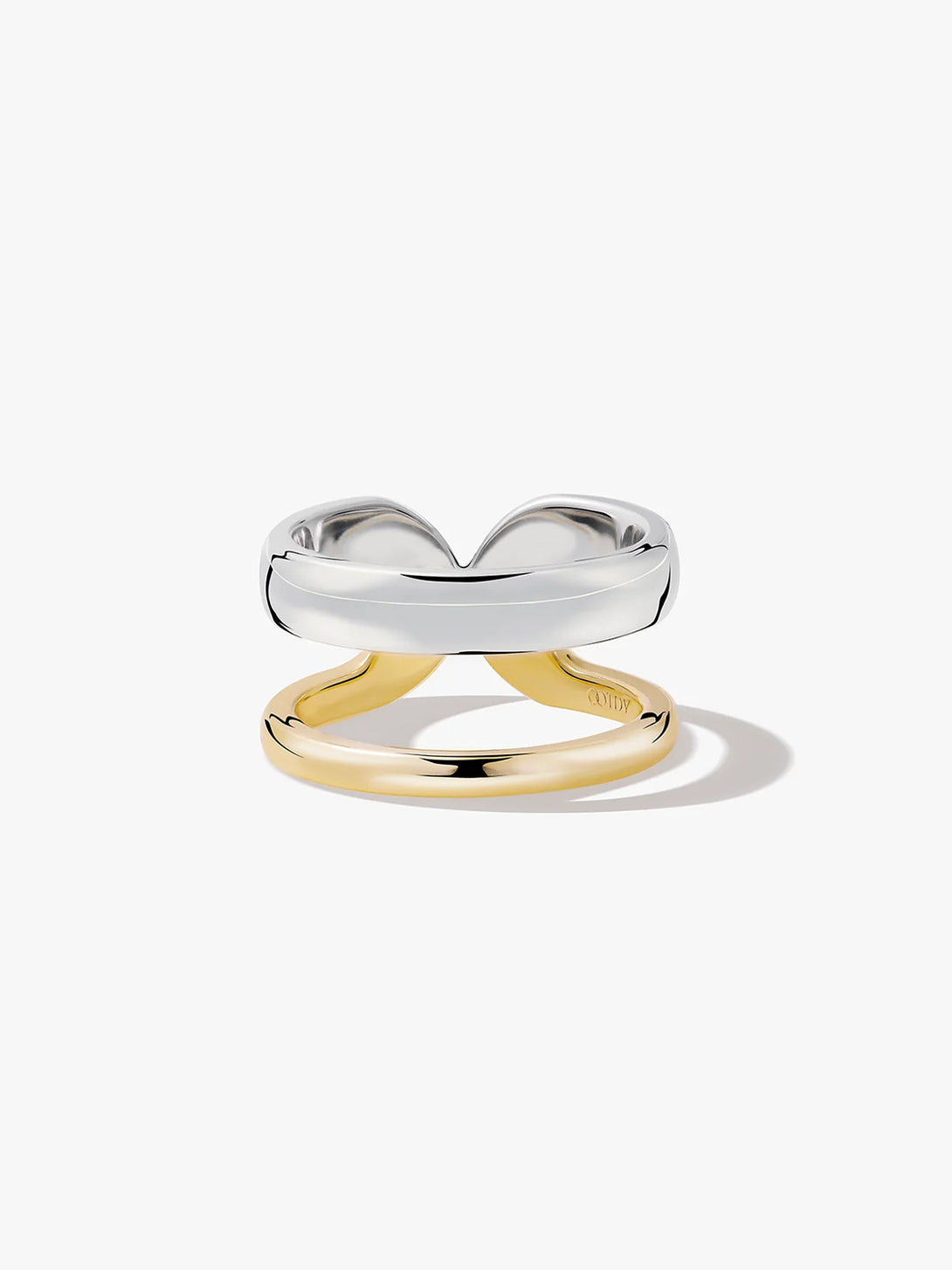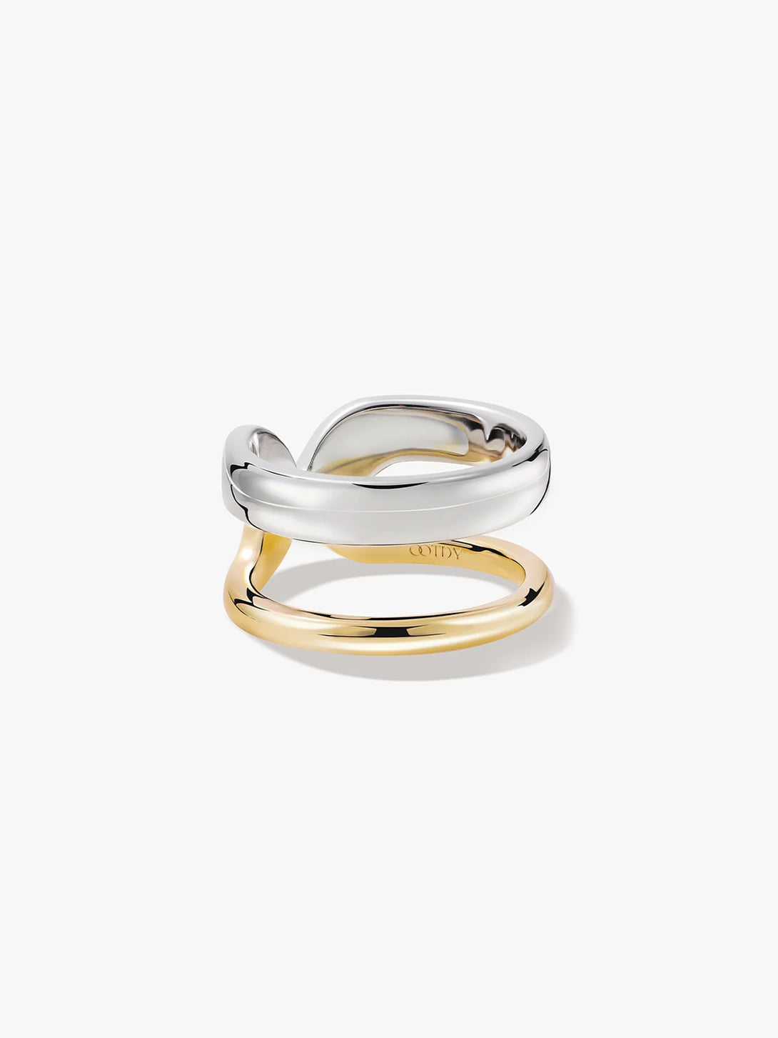 This ring features a striking dual-layer design that makes stacking effortlessly stylish. The mixed metals in varying widths create a beautiful interplay of textures, combining modern elegance with timeless versatility.