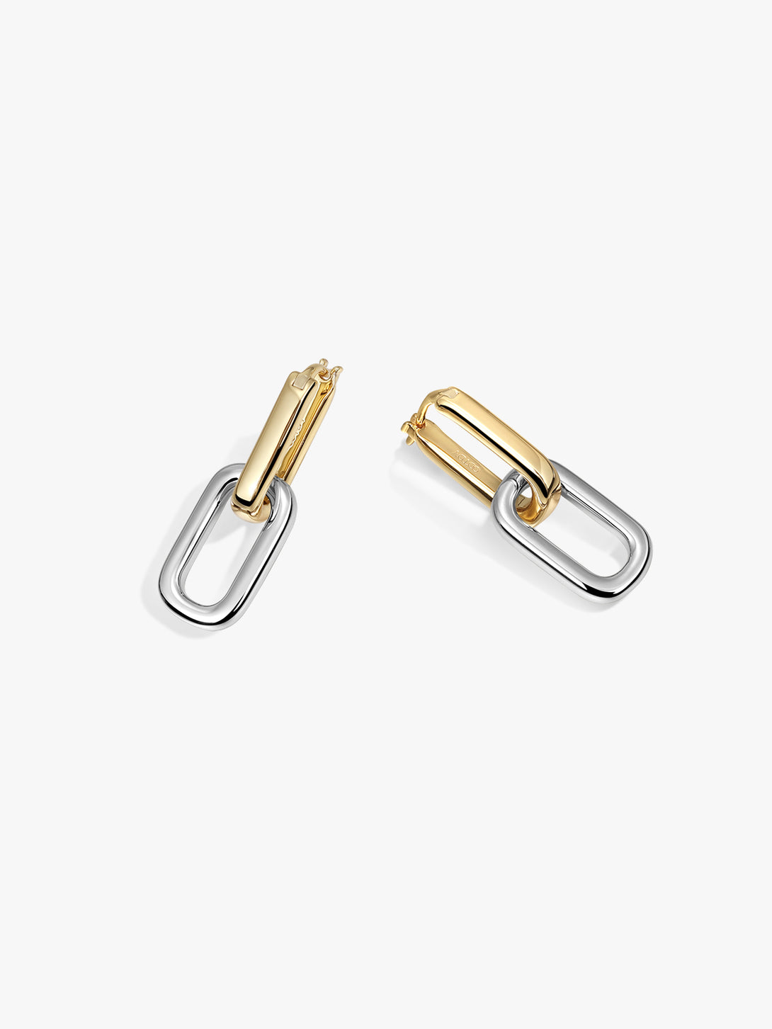 Discover duality with mixed metal ovate link hoops. This versatile piece transitions effortlessly between hoops and drop earrings, offering you the perfect style for any occasion.