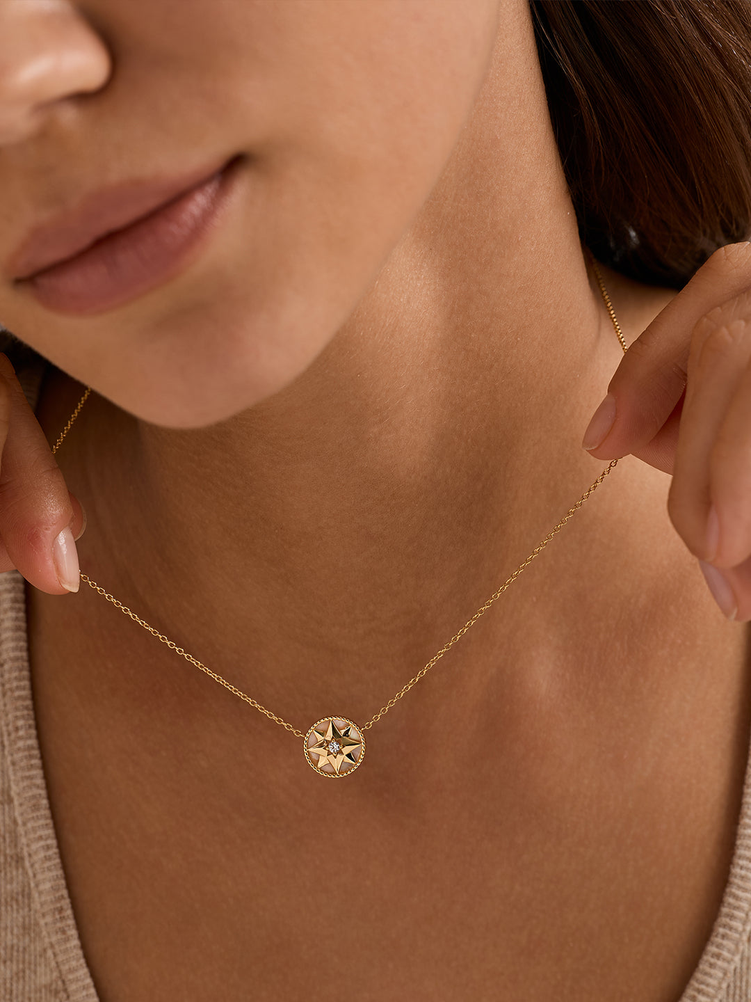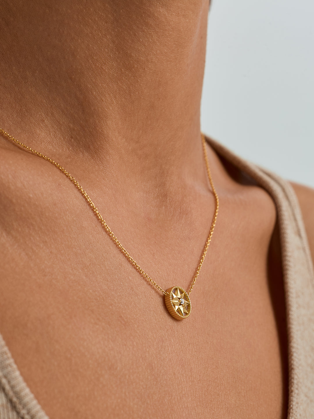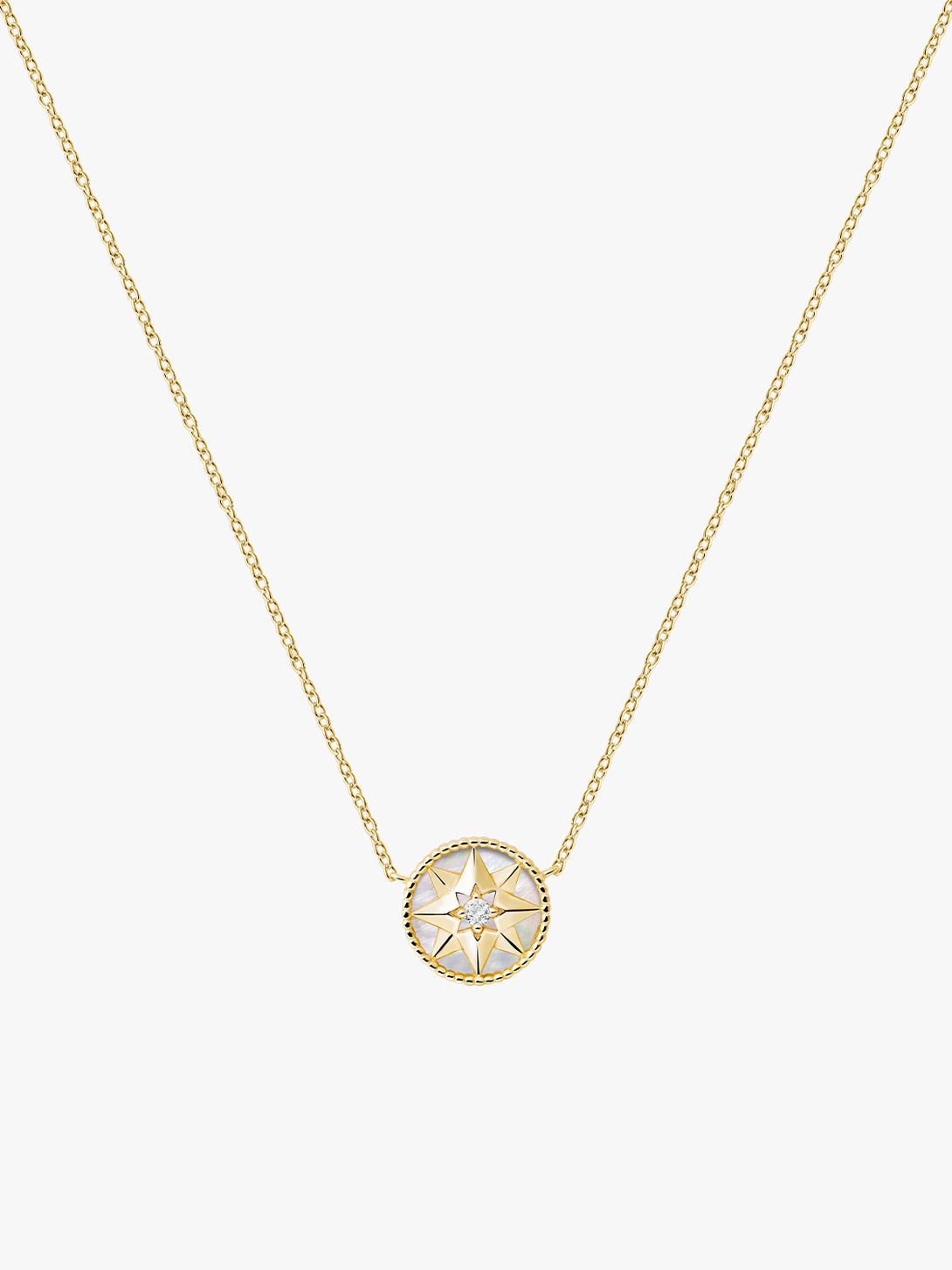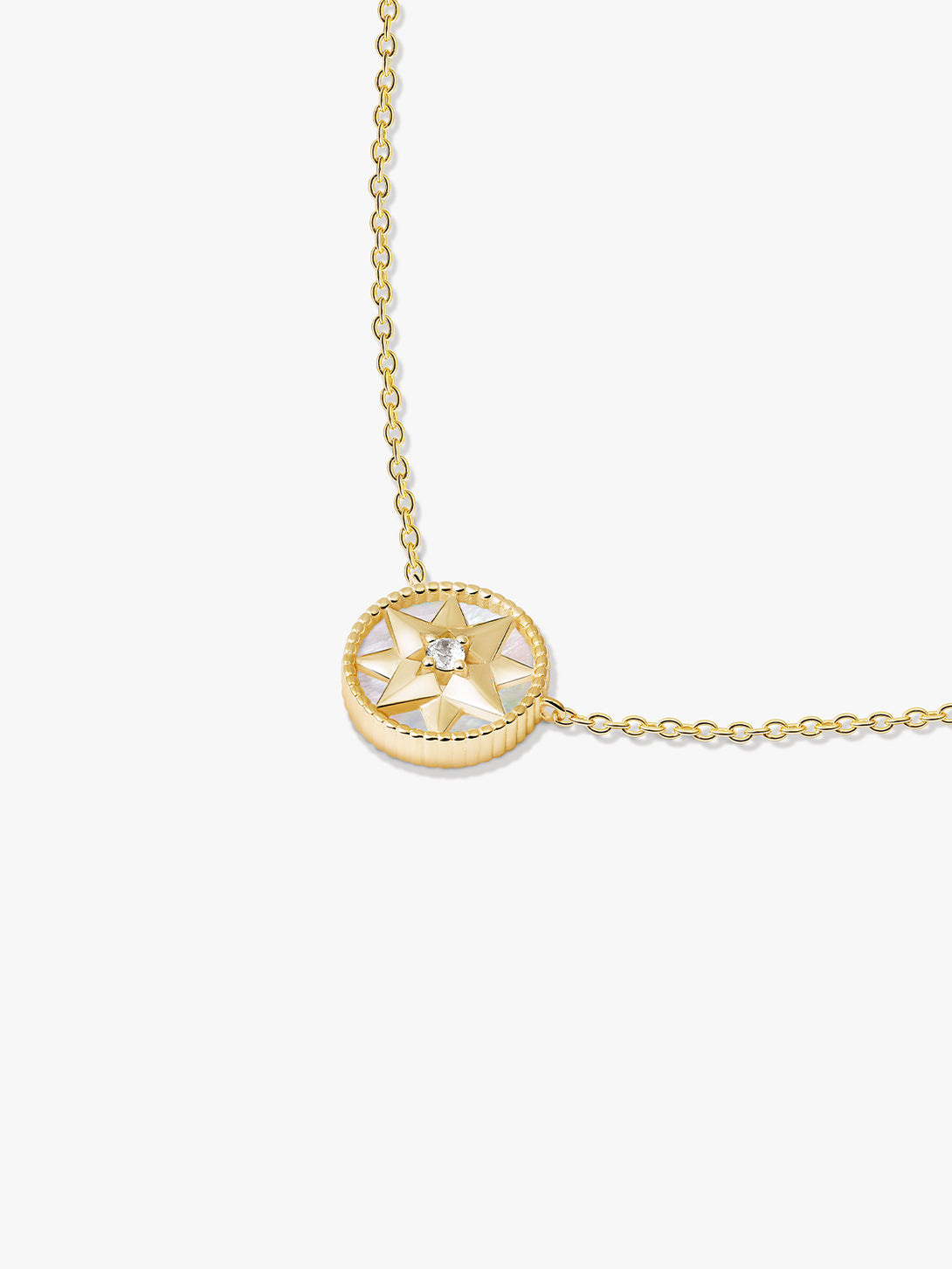 This timeless pendant features a radiant mother of pearl with a sparkling white sapphire at its center, drawing inspiration from compass illustrations. A symbol of guidance and direction, it embodies classic elegance with a modern twist.
