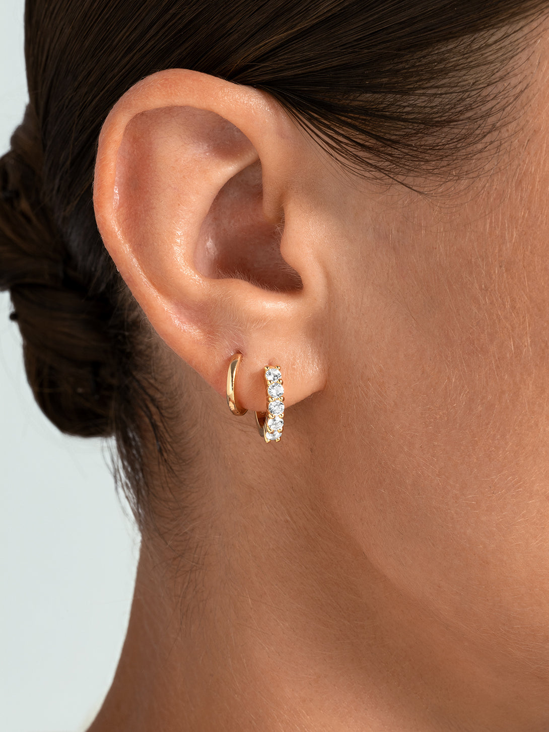A sleek huggie designed for everyday shine. Set with a continuous row of brilliant lab-grown white sapphires, these earrings catch the light with every move. Refined, minimal, and effortlessly wearable—perfect for stacking or wearing solo for a clean, polished look.