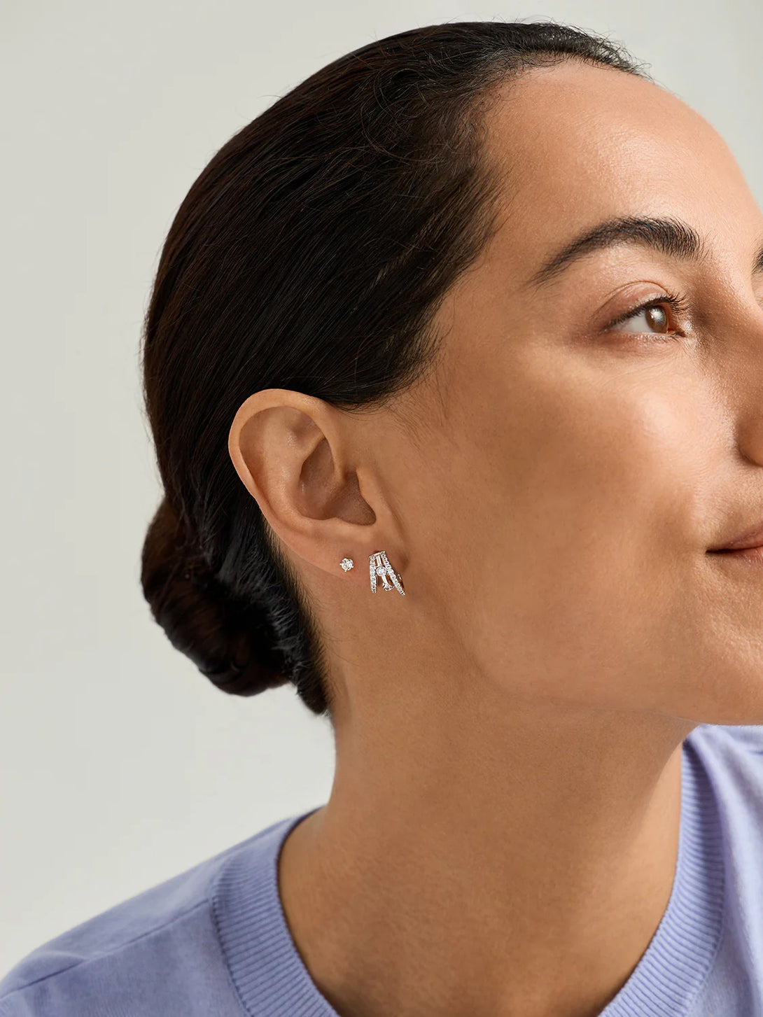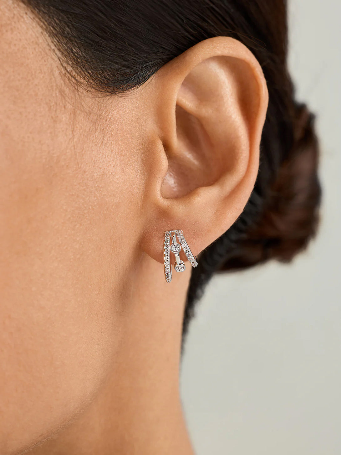 Vintage inspired meets everyday luxury. Get the look of a triple piercing with one hoop! The Triple Row Illusion Huggies shimmer with CZ stones.