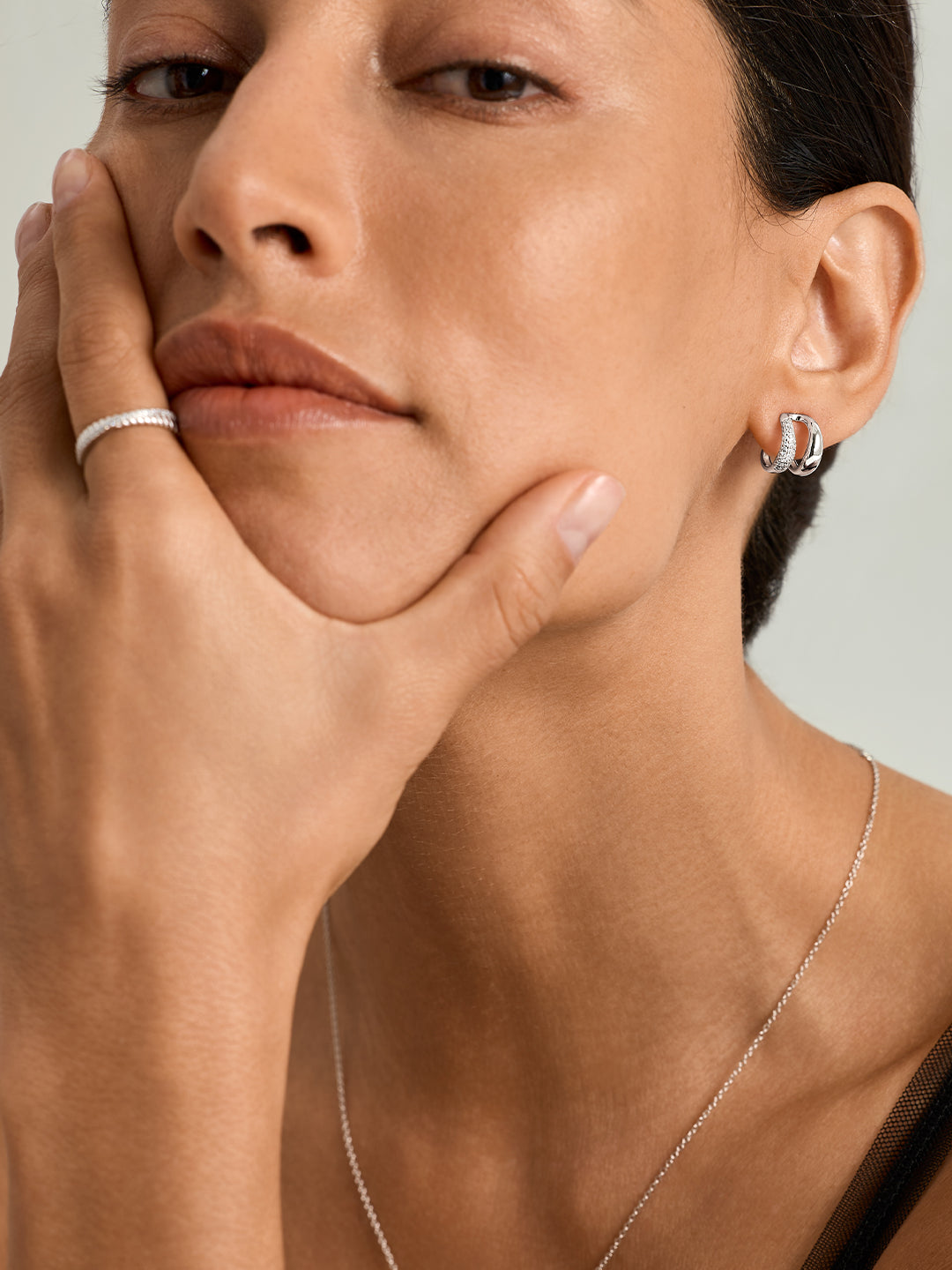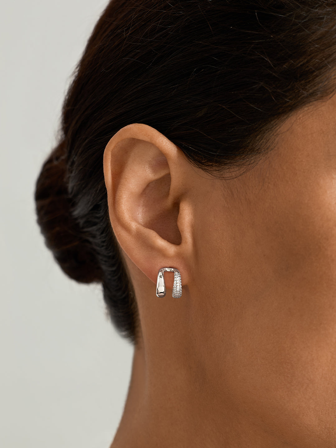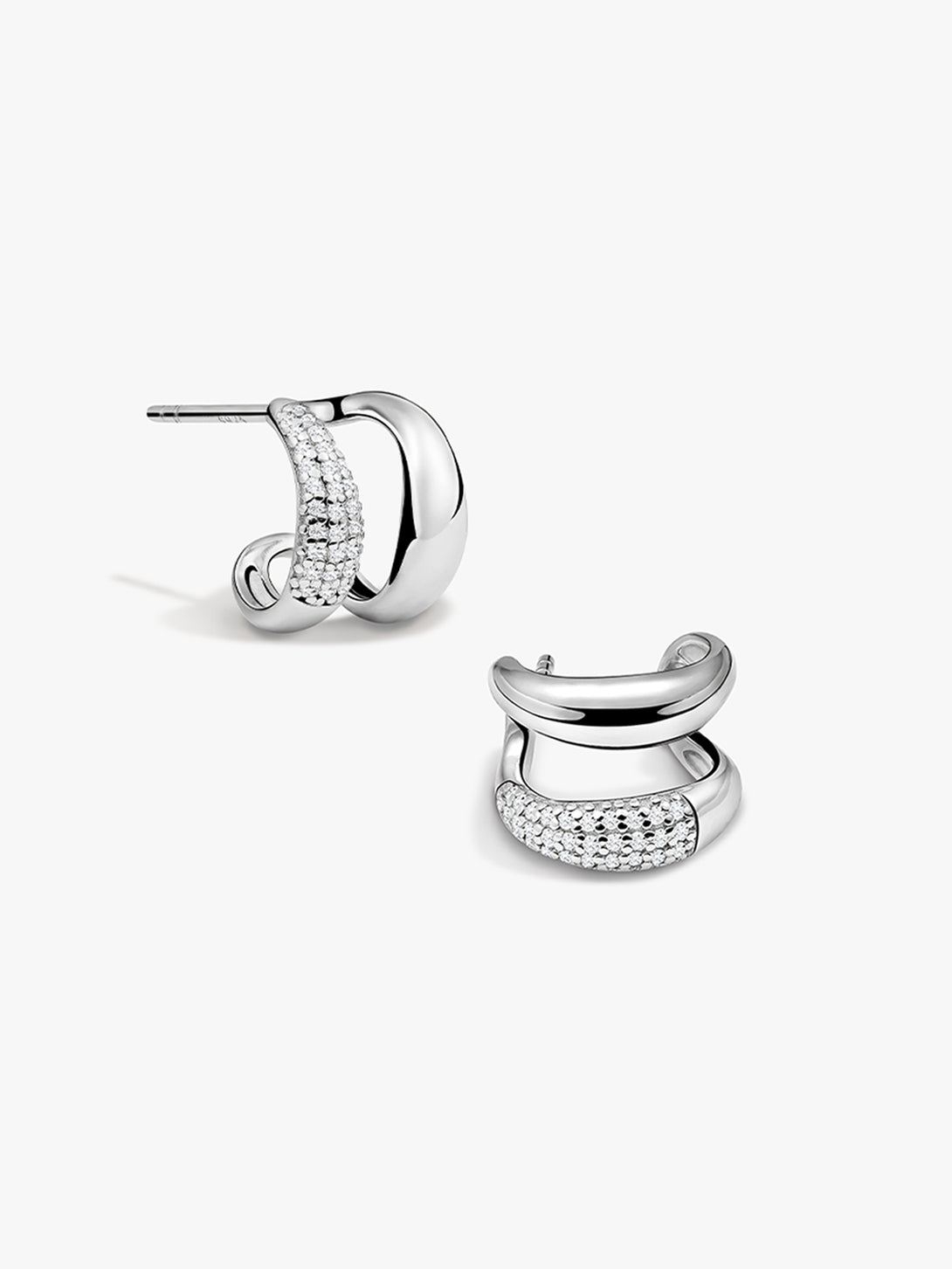 Stacked. Shiny. Statement-making. These hoops bring bold style without the fuss—pavé CZs light up a double-layered design that only needs one piercing. Perfect for turning heads with minimal effort.