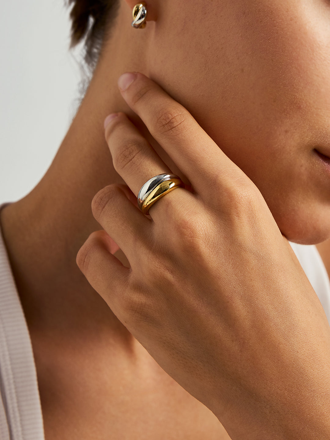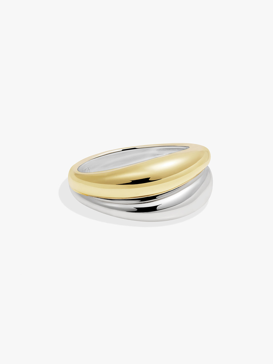 With its distinctive dome shape and layered design, this ring brings a unique touch to your stacking game. The blend of mixed metals in varying widths creates a dynamic interplay of textures, offering a perfect balance of modern sophistication and timeless style.