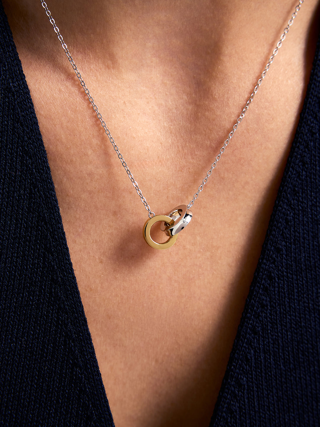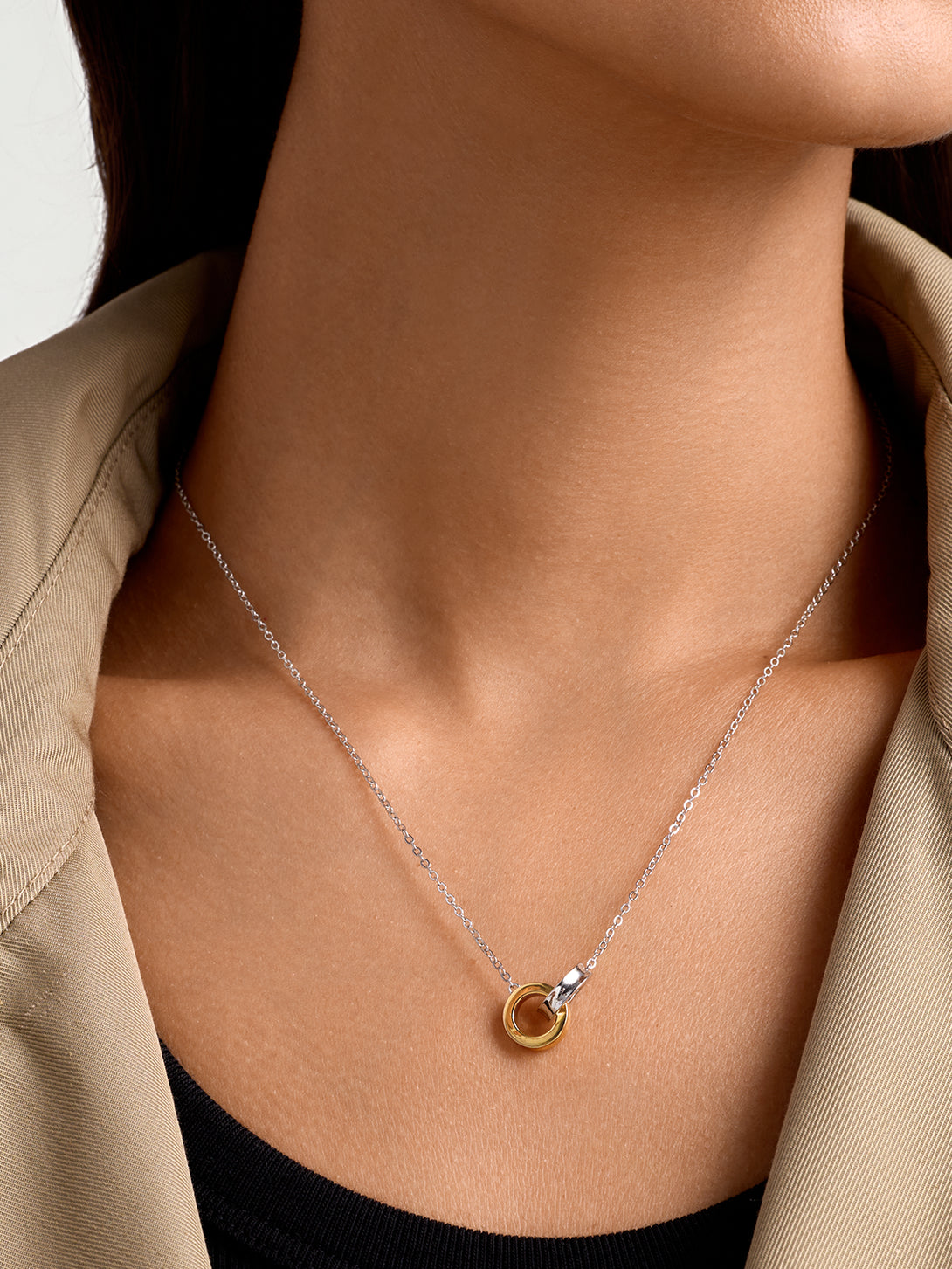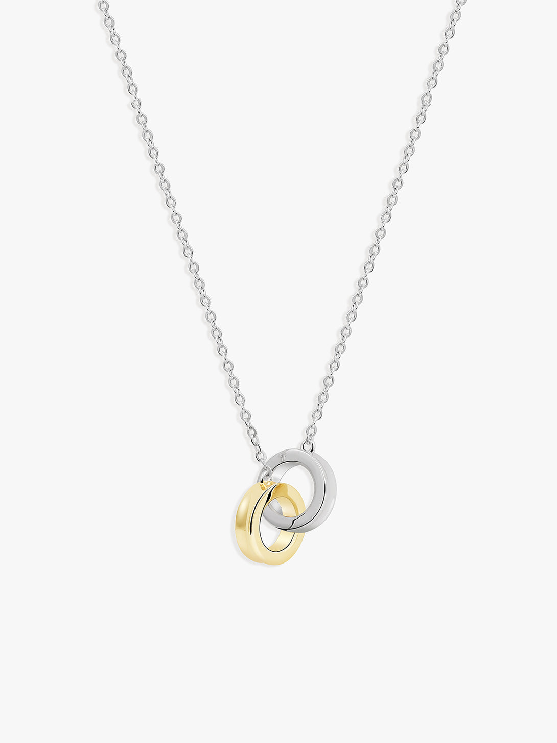 The Mixed Interlocking Circle Necklace features two interlocking circles in contrasting finishes, creating a modern, dynamic design. This versatile mixed-metal piece adds a contemporary touch to any outfit, perfect for both casual and formal occasions.