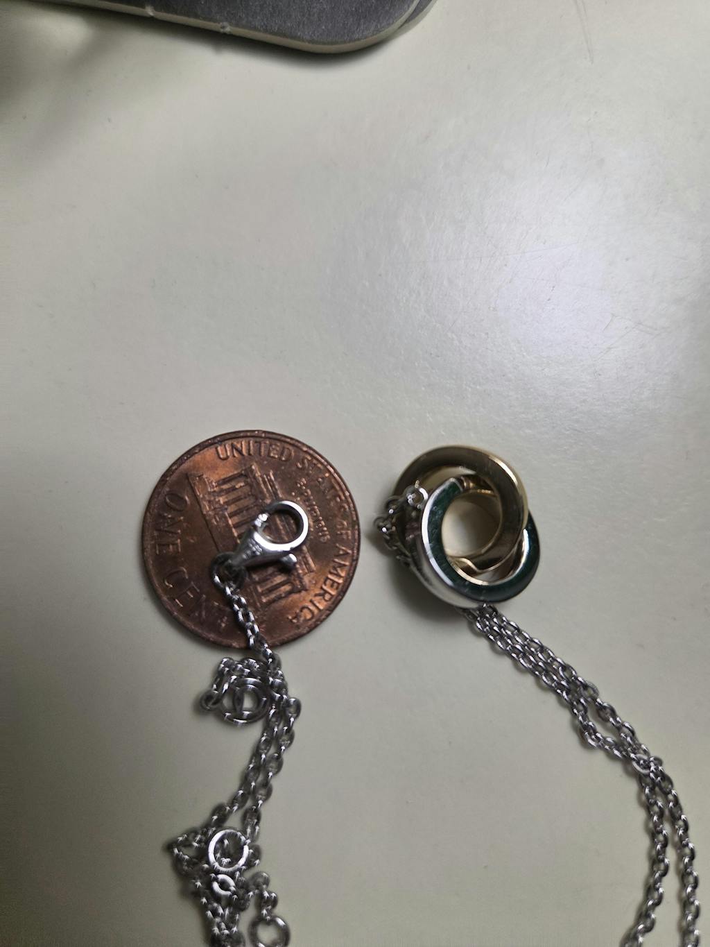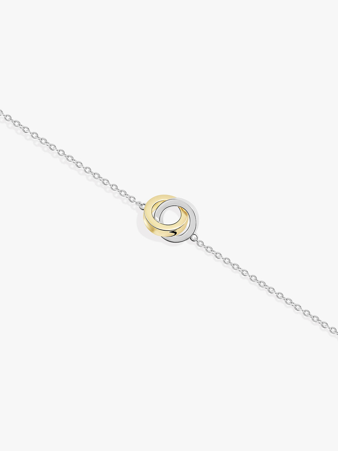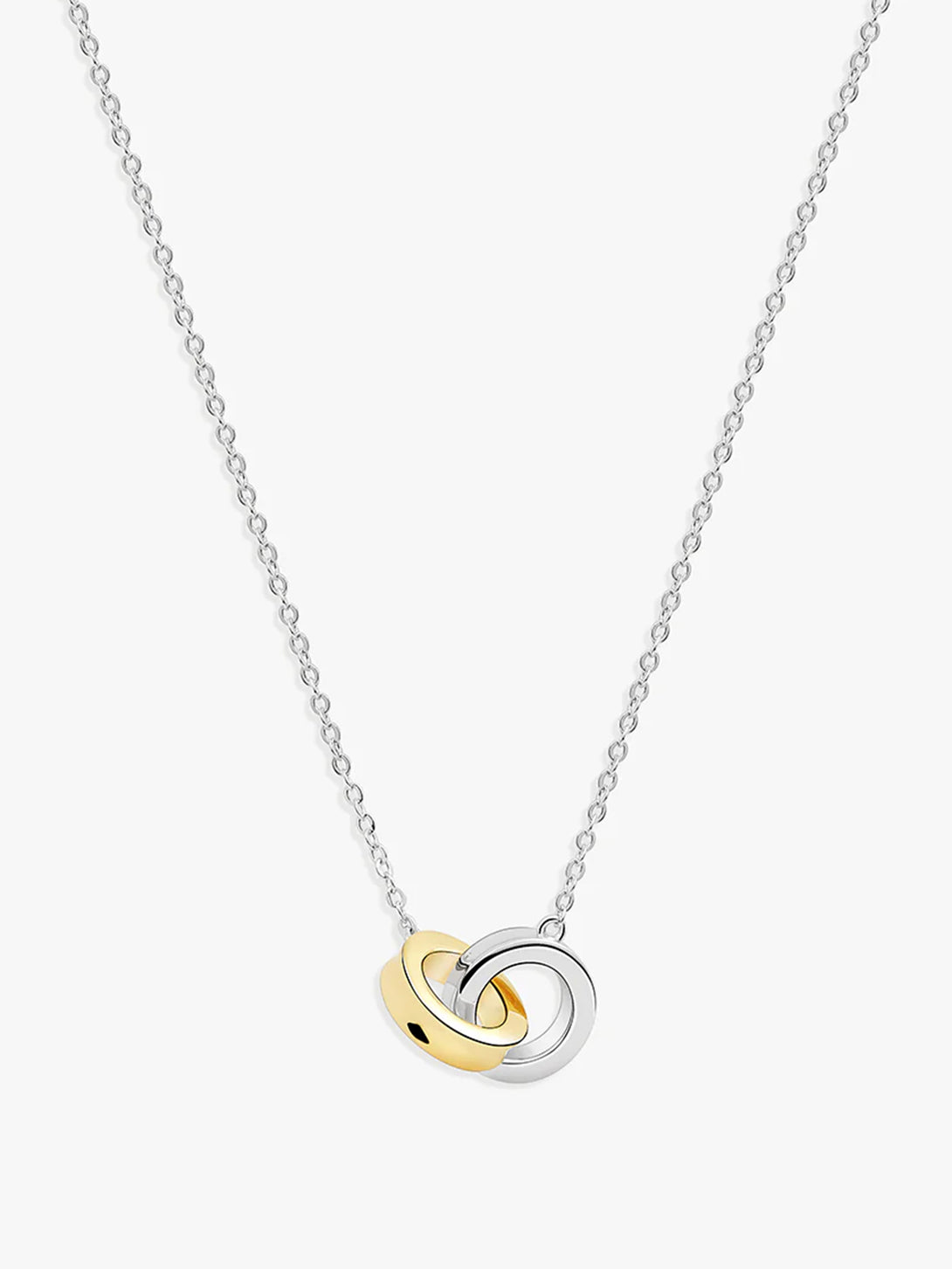 The Mixed Interlocking Circle Necklace features two interlocking circles in contrasting finishes, creating a modern, dynamic design. This versatile mixed-metal piece adds a contemporary touch to any outfit, perfect for both casual and formal occasions.