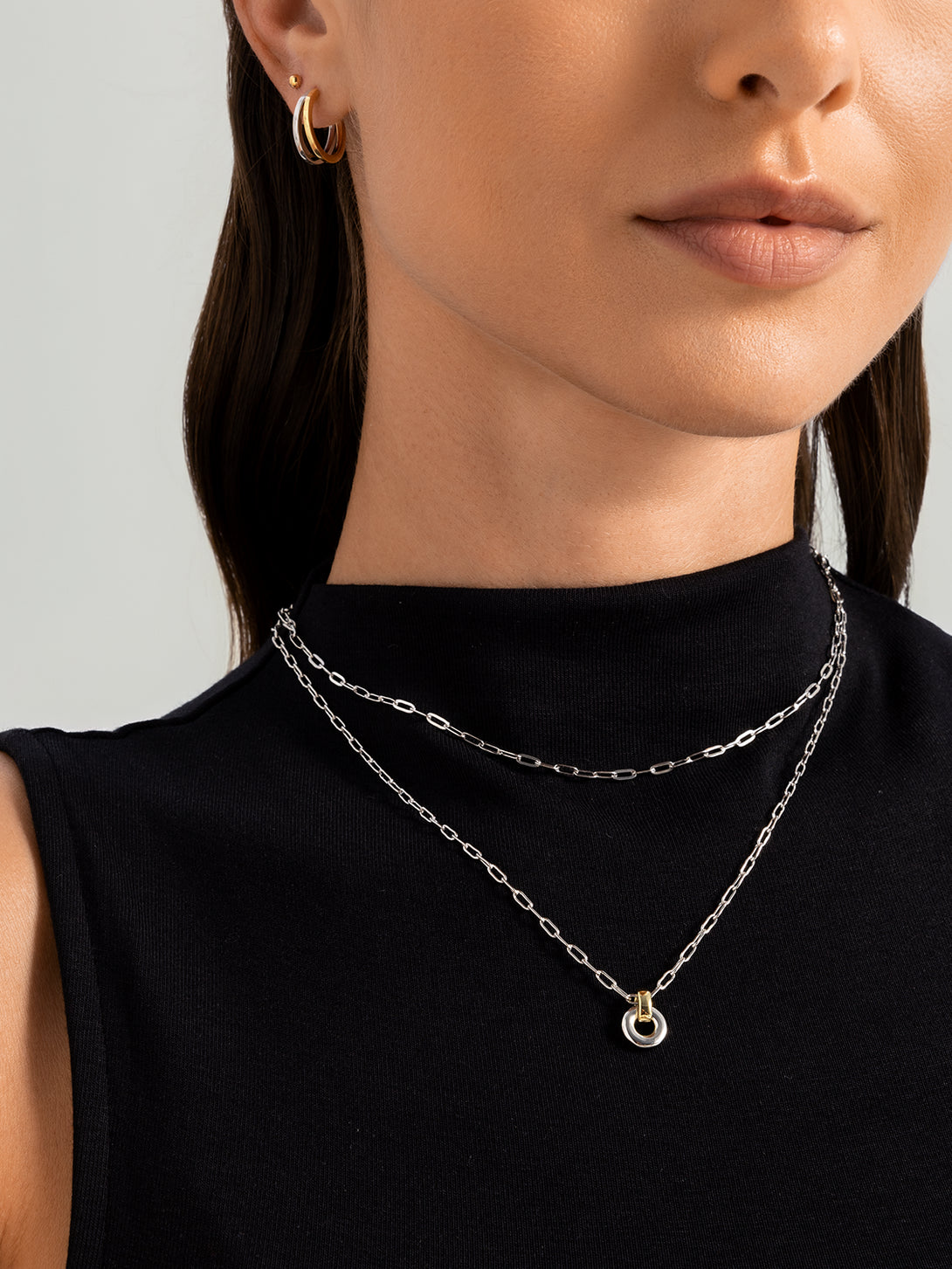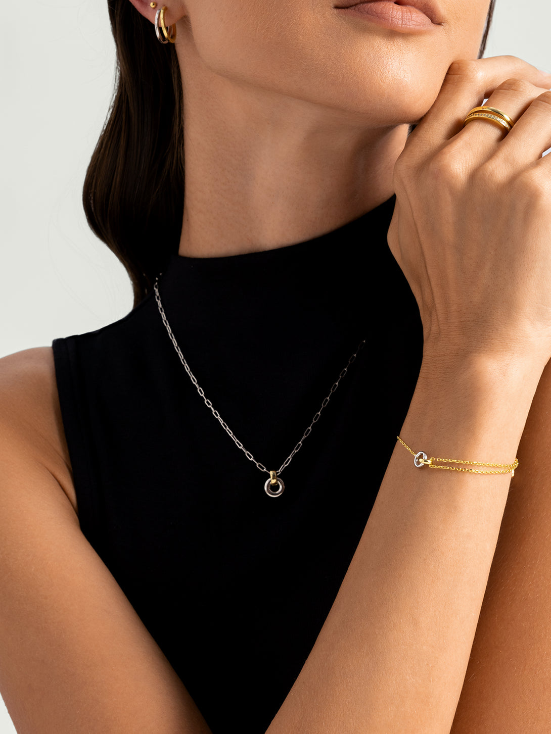 Two tones, endless style. This interlinked circle necklace merges classic and modern aesthetics, creating a sophisticated piece that transitions effortlessly from day to night.