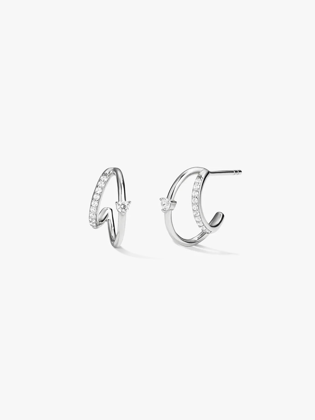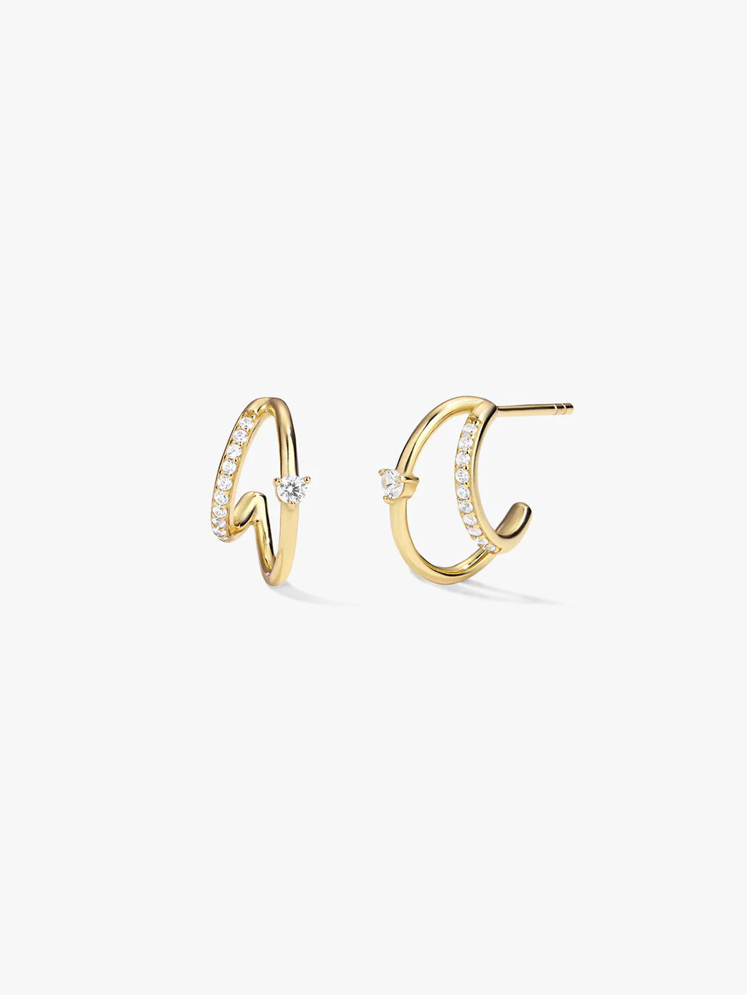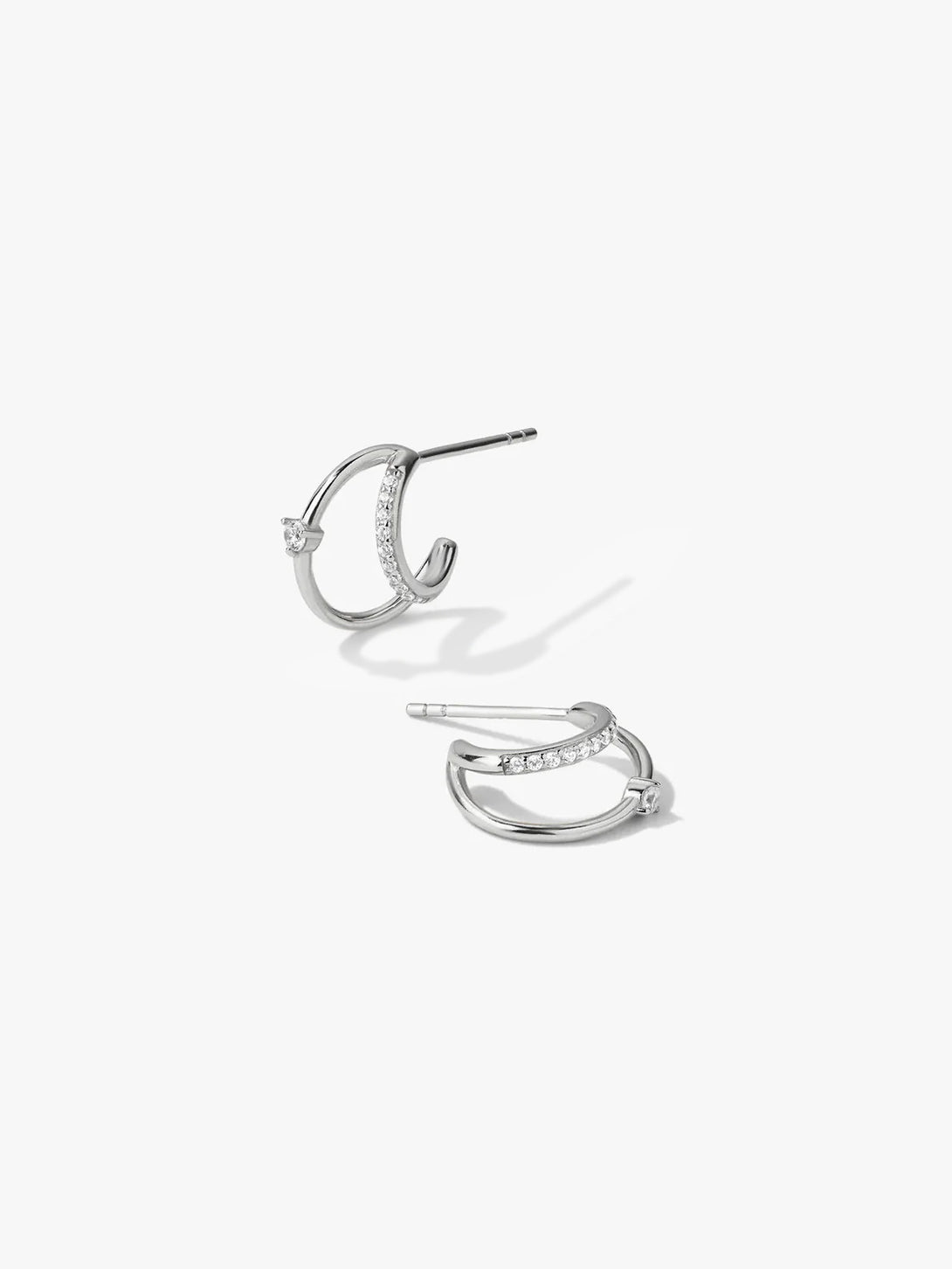 These delicate and shiny double-looped earrings are a must-have. They feature a larger hoop with a prong-set round white sapphire at the front, and a smaller hoop with pave cubic zirconia stones. Handcrafted in 18k Gold Vermeil on Sterling Silver.