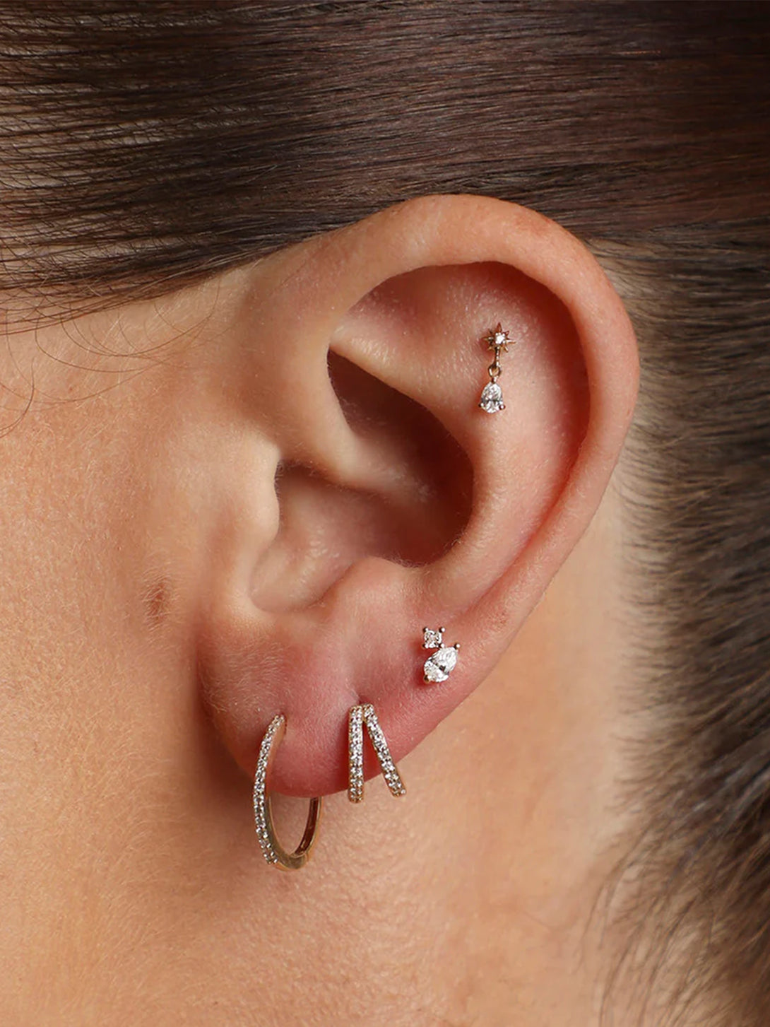 A luminous duo-stone stud featuring a pear-cut gem paired with a petite princess-cut stone for a refined touch of contrast. The angled placement adds soft movement and dimension, making it an effortless highlight in any ear stack. Finished with a flat-back post for all-day comfort—modern, delicate, and designed for everyday shine.