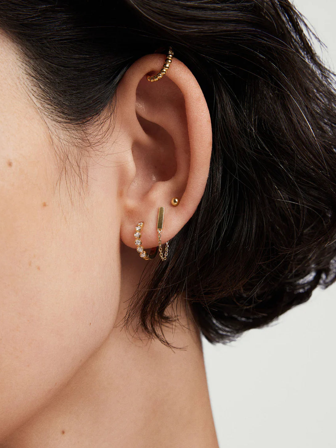 A modern update to the classic huggie. The Sapphire Bezel Row Huggies feature a line of bezel-set lab-grown white sapphires that wrap the front of the hoop, giving clean sparkle from every angle. Lightweight, polished, and perfect for everyday stacking.